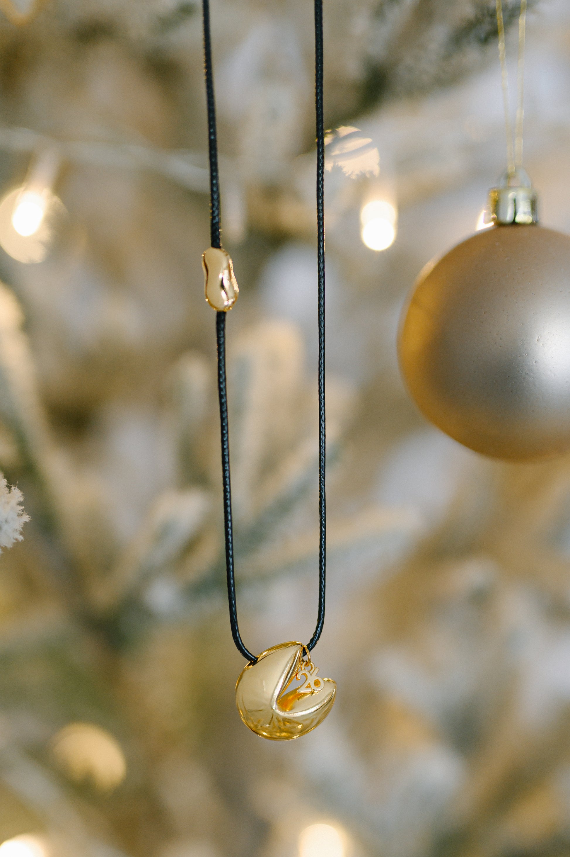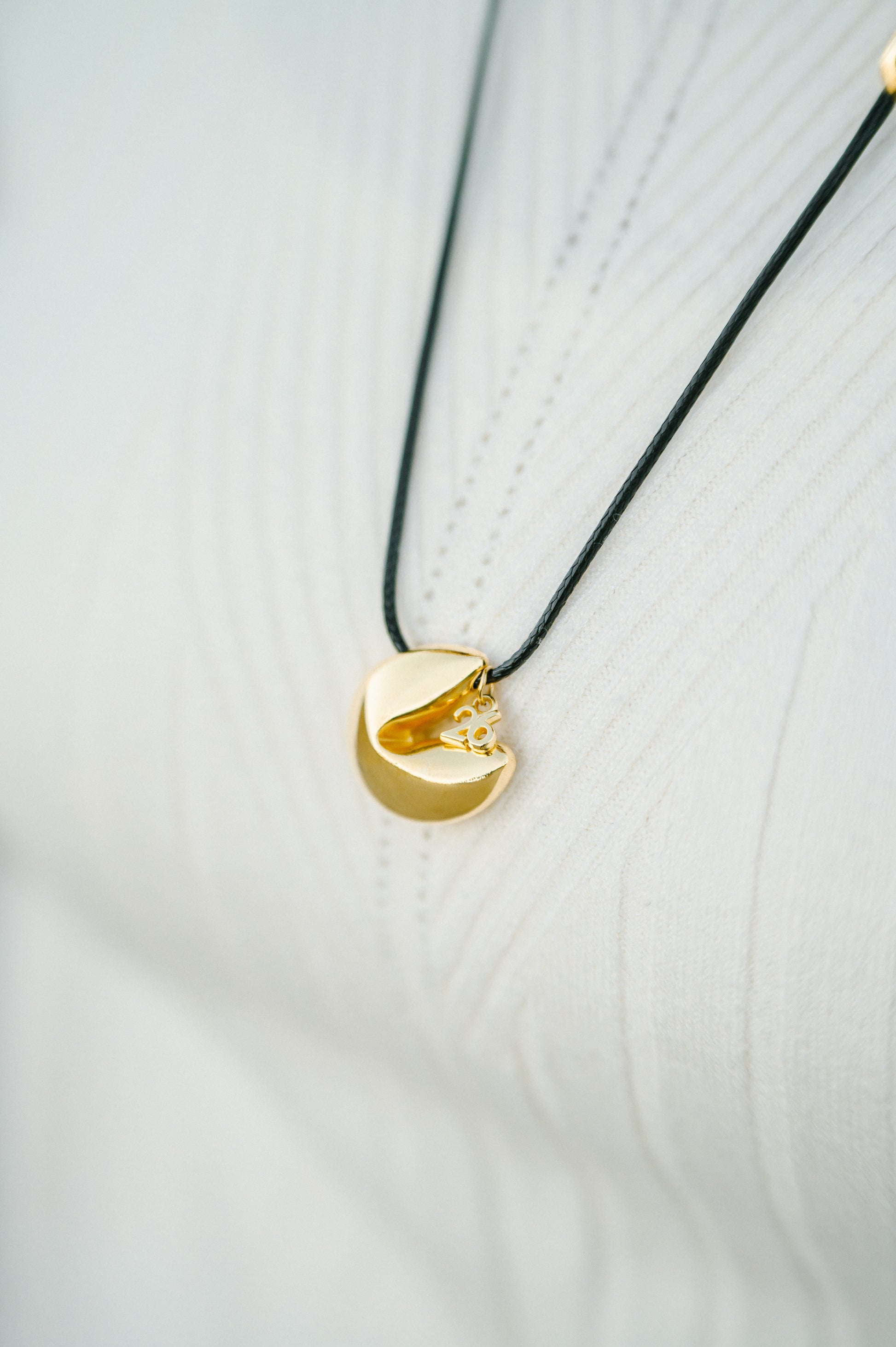 Minimal κολιέ-γούρι 2026, με σύμβολο fortune cookie και ένα μικρό κρεμαστό στοιχείο “26”. Διαθέσιμο σε χρυσό χρώμα (επιχρυσωμένος ορείχαλκος 24Κ), περασμένο σε κομψό μαύρο κορδόνι-φίδι 75 cm. Μια διακριτική υπενθύμιση ότι η καλή τύχη έρχεται συχνά εκεί που δεν το περιμένεις.